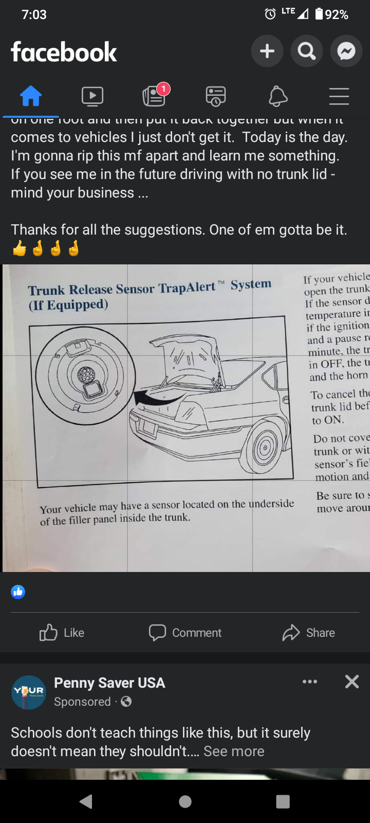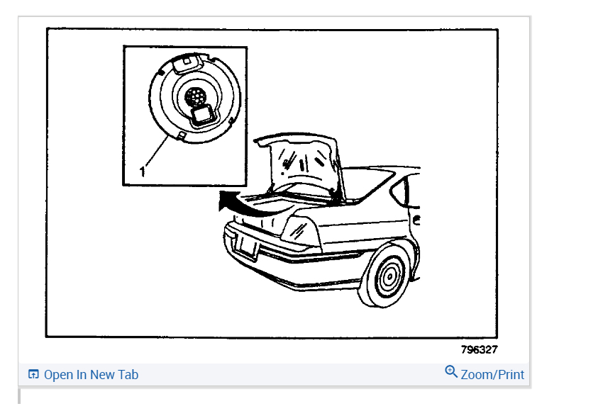 Some vehicles may be equipped with the GM TrapAlert system. This system will release the deck lid and sound the horn if a combination of a difference in temperature compared to ambient and a movement is detected in the rear compartment by the rear compartment occupant sensor (1).