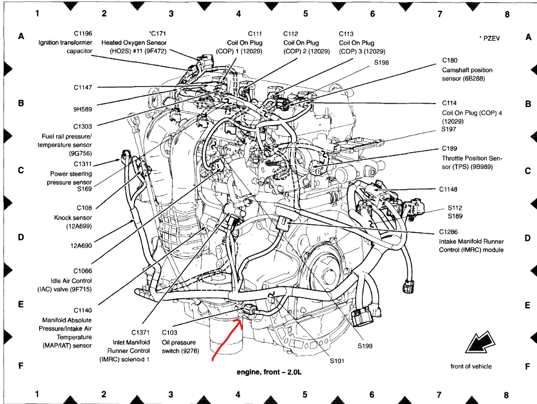 The sensor is located on the engine block, above the oil filter, between the oil filter and the intake manifold.