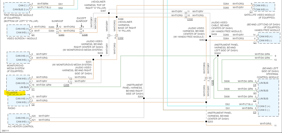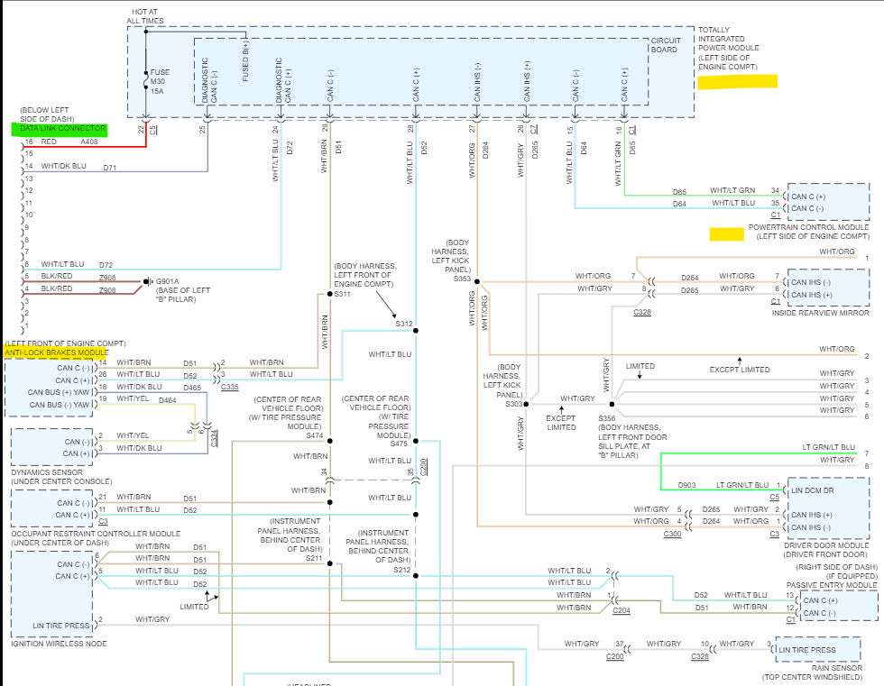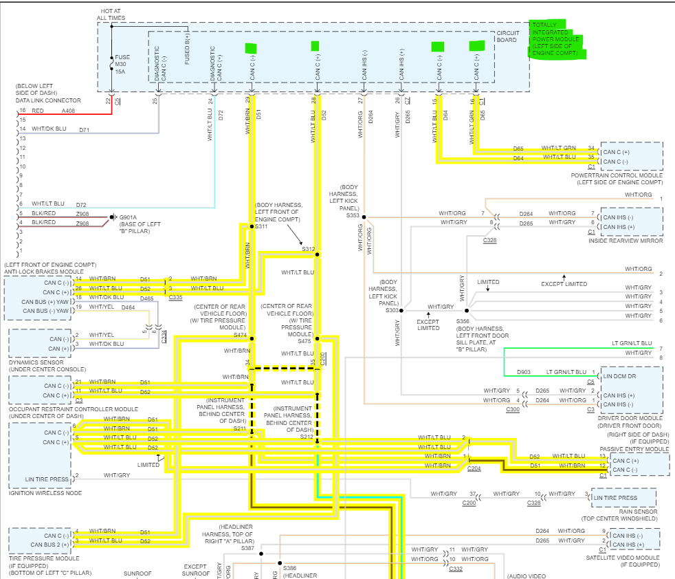 Just to give you an idea of the Computer network in your vehicle. Pages 1 and 2 is the Totally Integrated Power Module (TIPM) and the Engine (Powertrain Control Module). Every Blue box on pages 1 to 4 is an Electronic Control Module in the Vehicle. Page 5 shows you more in depth what the TIPM does. If you notice on the top right is the Powertrain Control Module. Those 2 (in yellow) wires are the Network wires that run into the TIPM. From there all the other modules in the vehicle are connected to it. So, if there is a problem with the TIPM, all the data has to go through it to get to the Powertrain Control Module (ECM). It's very complex.