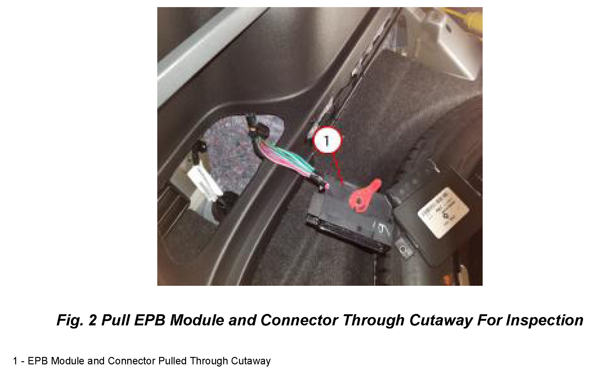 1. The Electronic Parking Brake (EPB) module is located in the back left side of the cargo area interior, near the spare tire (Fig. 1) and is attached by a slide locking retainer and fastener.