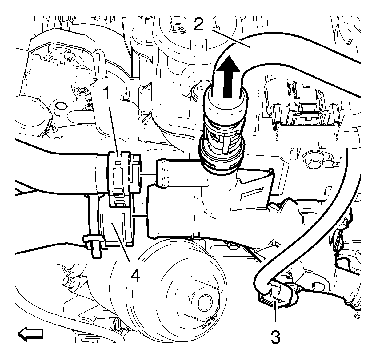 16. Remove the radiator outlet hose (3) from the engine coolant thermostat housing (1).