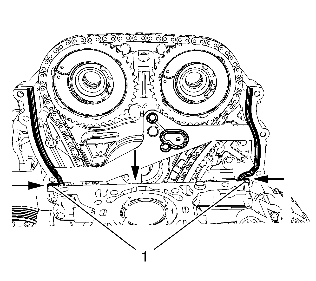 6. Apply sealing compound to the shown areas (1). Refer to Adhesives, Fluids, Lubricants, and Sealers See: Engine > Fluid Types > Adhesives, Fluids, Lubricants, and Sealers.