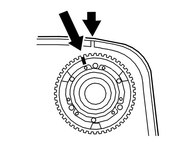 Turn the timing gear pulley clockwiseuntil the screws at the oval holes are in the limit position. Continue turning clockwise until the timing gear pulley marking is 1 cogs before the marking on the upper timing cover.