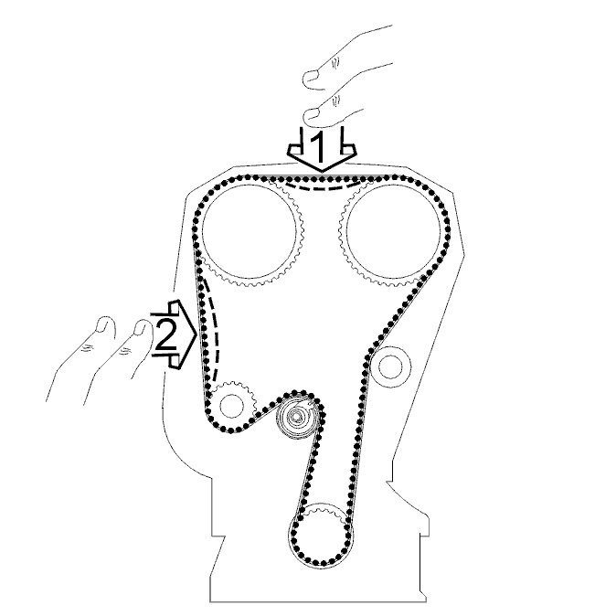 Press the timing belt to check that the indicator on the belt tensioner moves easily.