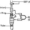 (e)Connect SST (union and hose) to the injector, and hold the injector and union with SST (clamp). SST 0926841046