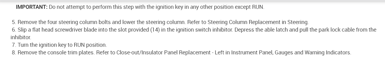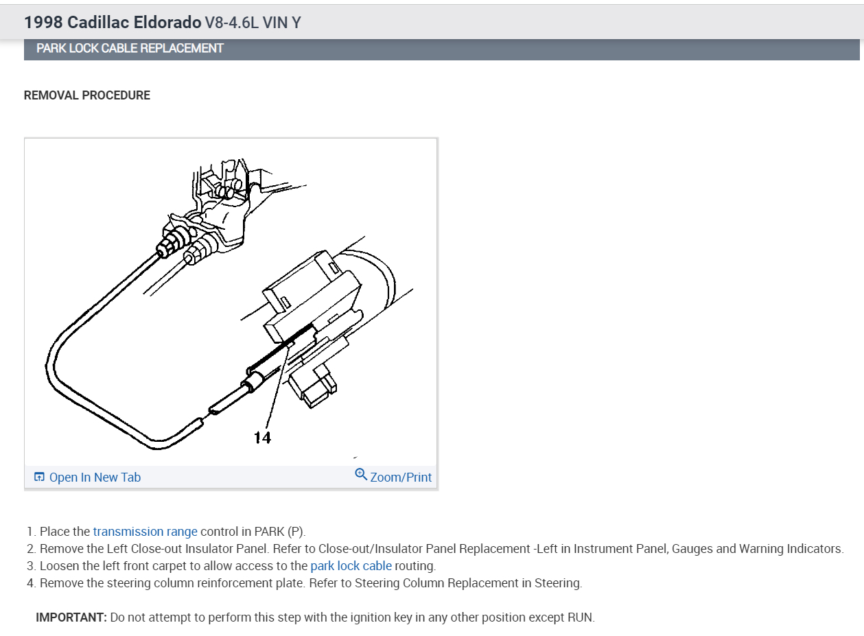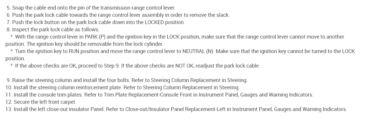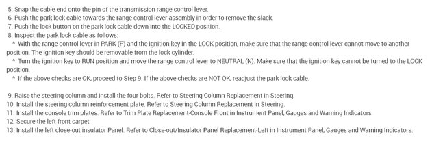 4. If the shift lever will move out of the park position with the key in the "Lock" position or the key lock cylinder will not turn to the "Lock" position with the shift lever in the "Park" position the readjust the park lock cable or refer to Automatic Transmission Shift Lock Control System Check in Steering.