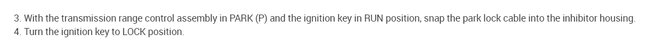 Place the ignition key into the "Lock" position. If the key cannot be rotated to the lock position, lift the adjuster button on the park lock cable and slide the adjuster rearward in vehicle (compressing the spring) and rotate the key into the locked position.