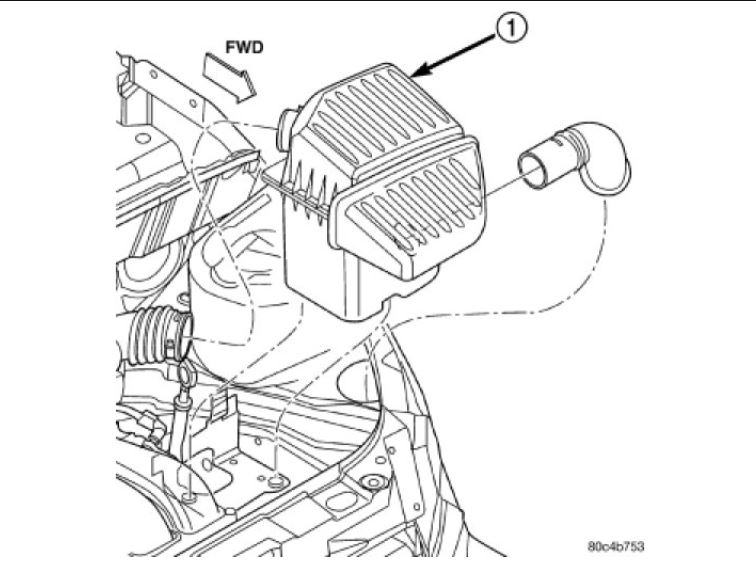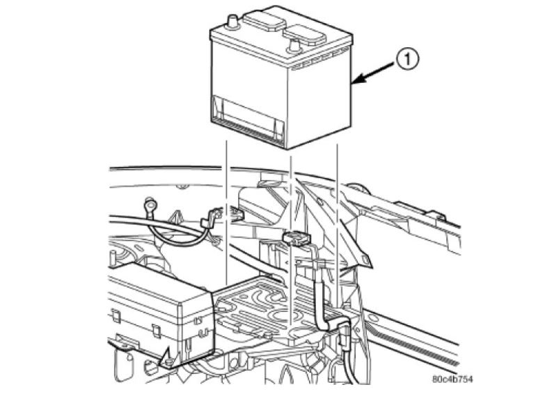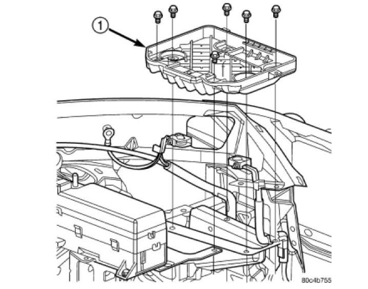 7. Disconnect both battery cables, remove battery hold down clamp and bolt, and remove battery (1).
