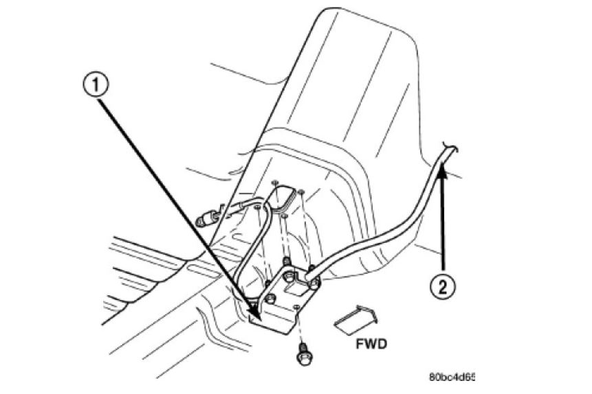 12. Remove remaining grommet plate (1) screw and remove cable assembly (2) from vehicle.