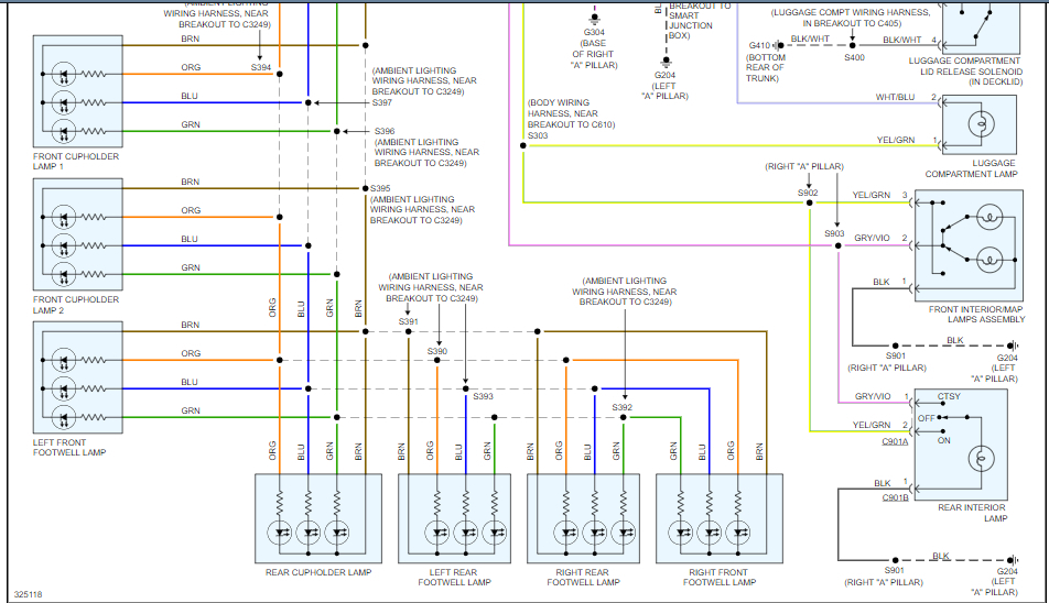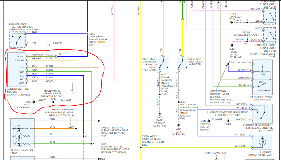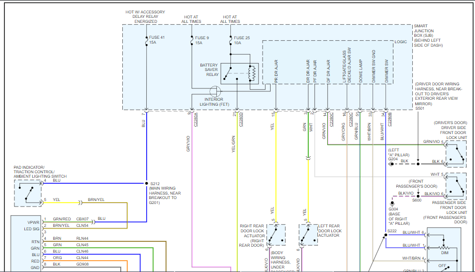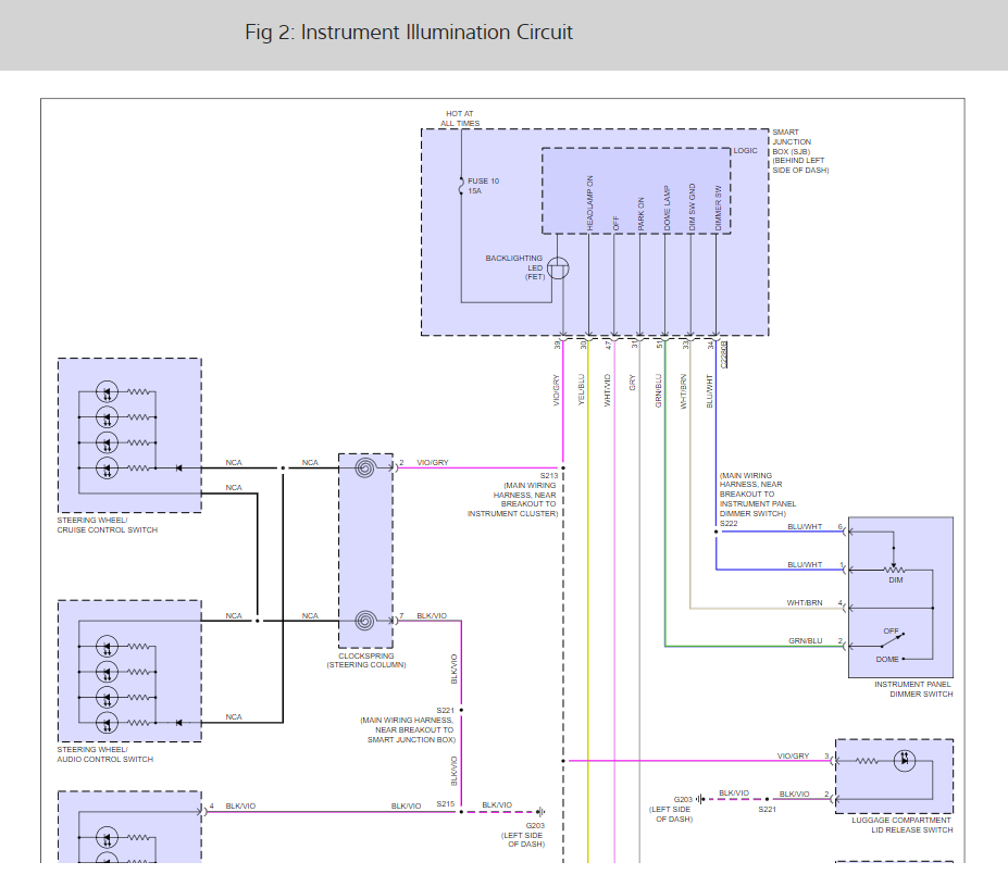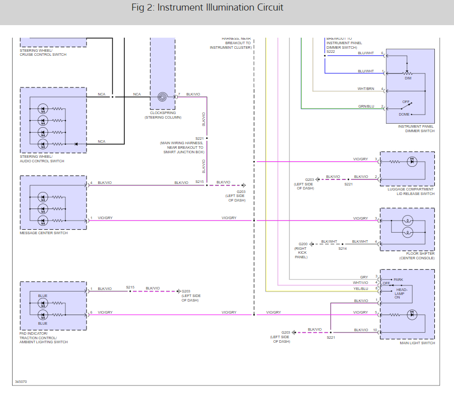 Also, if you look at images 5 and 6 from the second reply(the instrument panel illumination circuit diagram), you can see all the areas that are missing backlighting and where they connect. At the top of image 5, you will see the Smart Junction Box or Cabin Fuse Box. The first wire coming out of it reading from left to right is the Violet/gray wire. Everything branching off from it is missing its backlighting. This includes on the left side starting at the top and going down, the steering wheel cruise control switch, steering wheel audio control switch, message center switch, pad indicator/traction control/ ambient light switch. On the right side starting at the bottom and going up it includes the mainlight switch, floor shifter, and luggage compartment lid release switch.