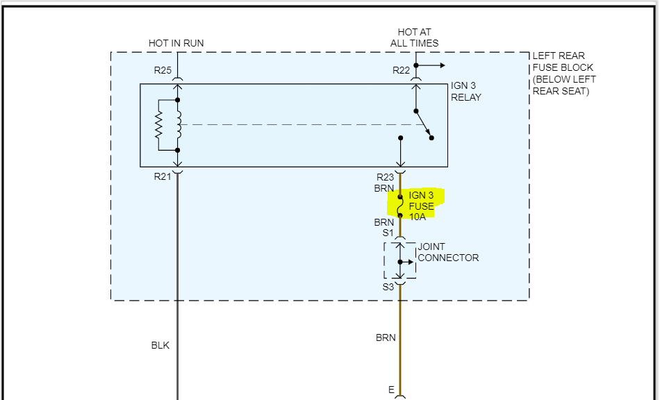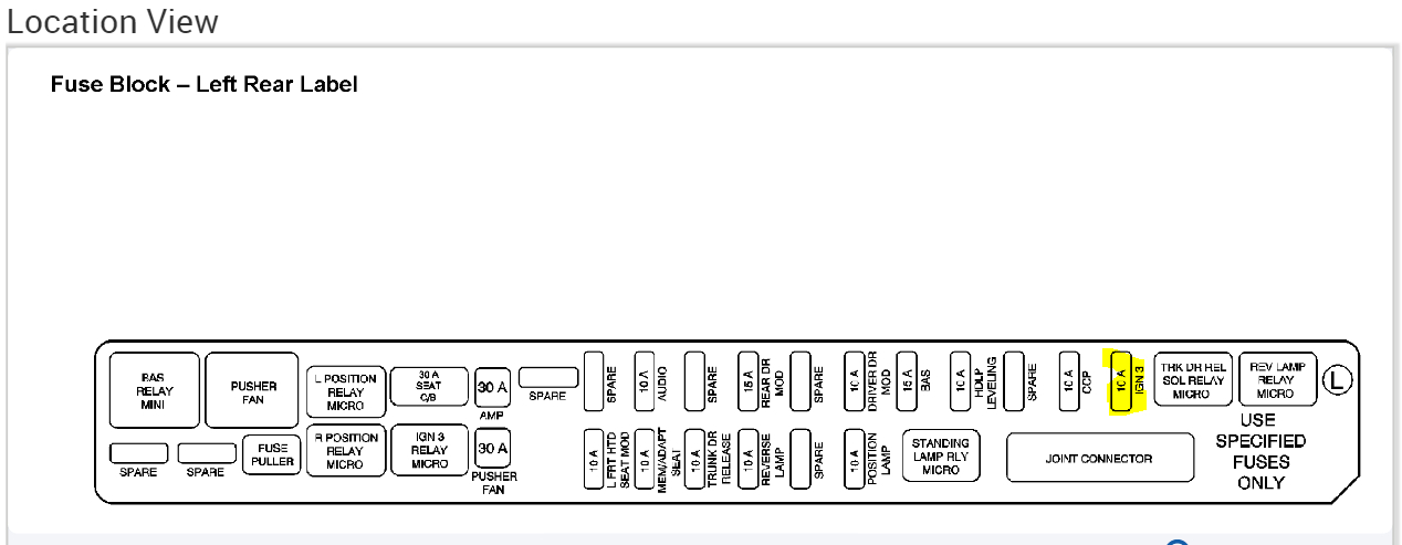 Next, I need you to check the IGN 3 fuse in the left rear fuse box under the left rear seat. Check to make sure the fuse is good and there is power to it with the key on and the brake pedal pressed. You will need a helper for that.