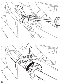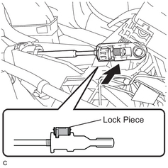 Push the 2 claws together at the top of the transmission control cable lock piece. While holding the 2 claws together, push the 2 lugs on the bottom of the lock piece toward each other and upward to pull out the lock piece.