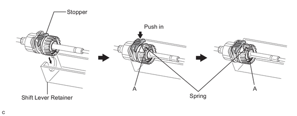 Install the outer part of the transmission control cable to the shift lever retainer. Check that the spring is positioned at "A" and push in the stopper.