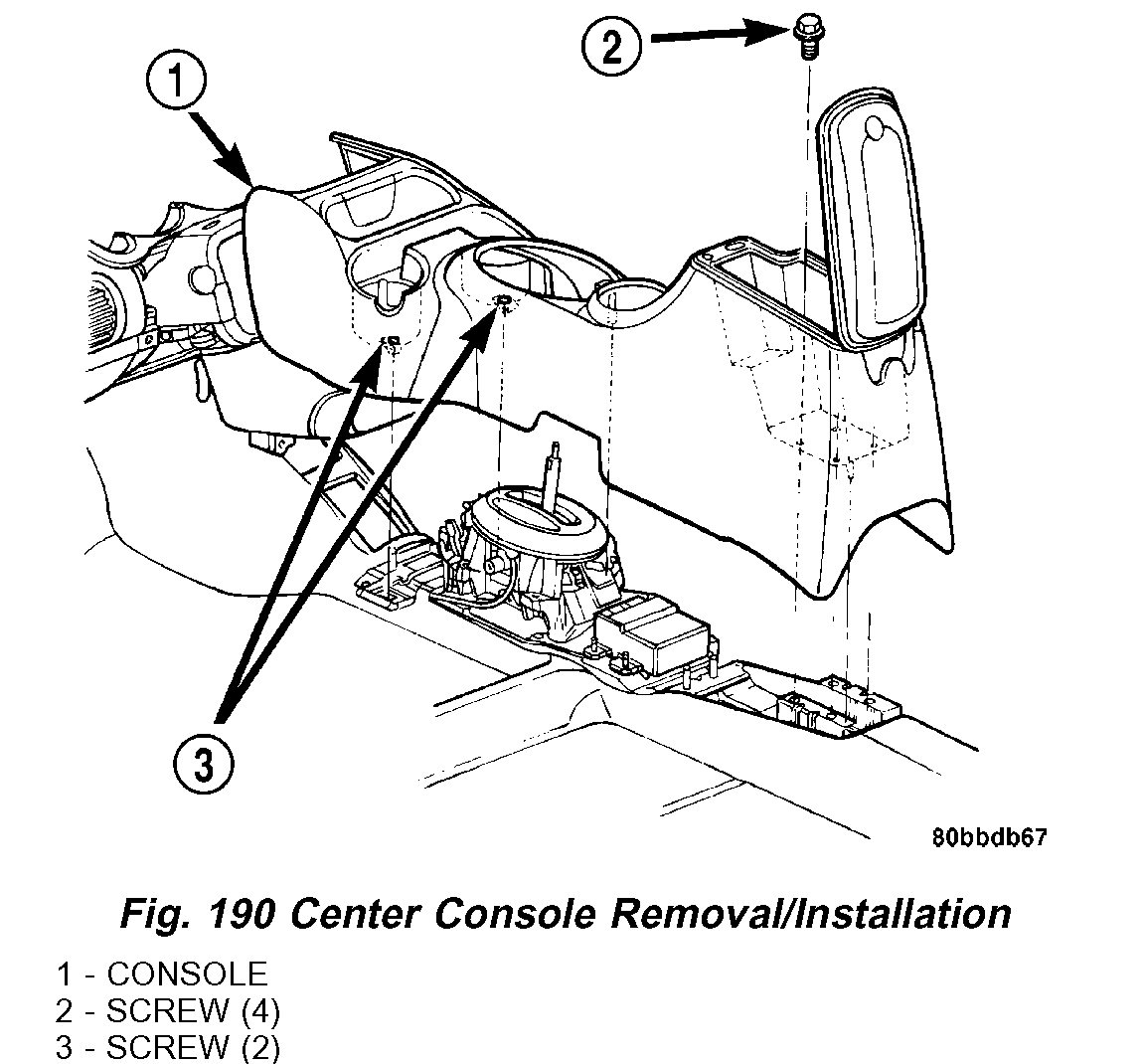 2. Remove the center console assembly as shown in (Fig. 190).