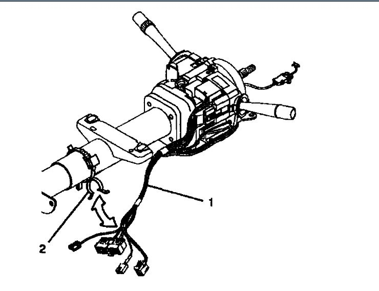 3. Remove the wire harness strap (2) from the steering column and the wire harness assembly (1).