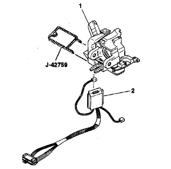 8. Insert J42759 into the ignition lock cylinder case (1) and slide the ignition switch (2) out.
