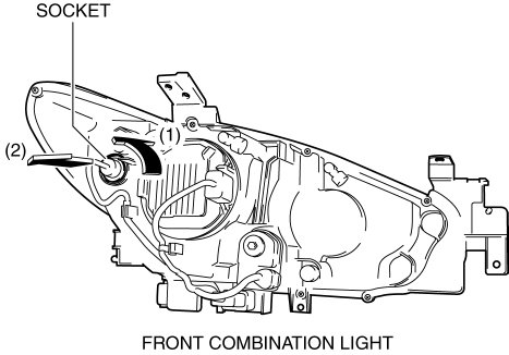 4. Rotate the socket in the direction of the arrow (1) shown in the figure and remove it from the front combination light in the direction of the arrow (2) shown in the figure.
