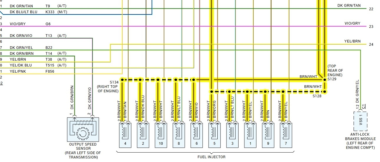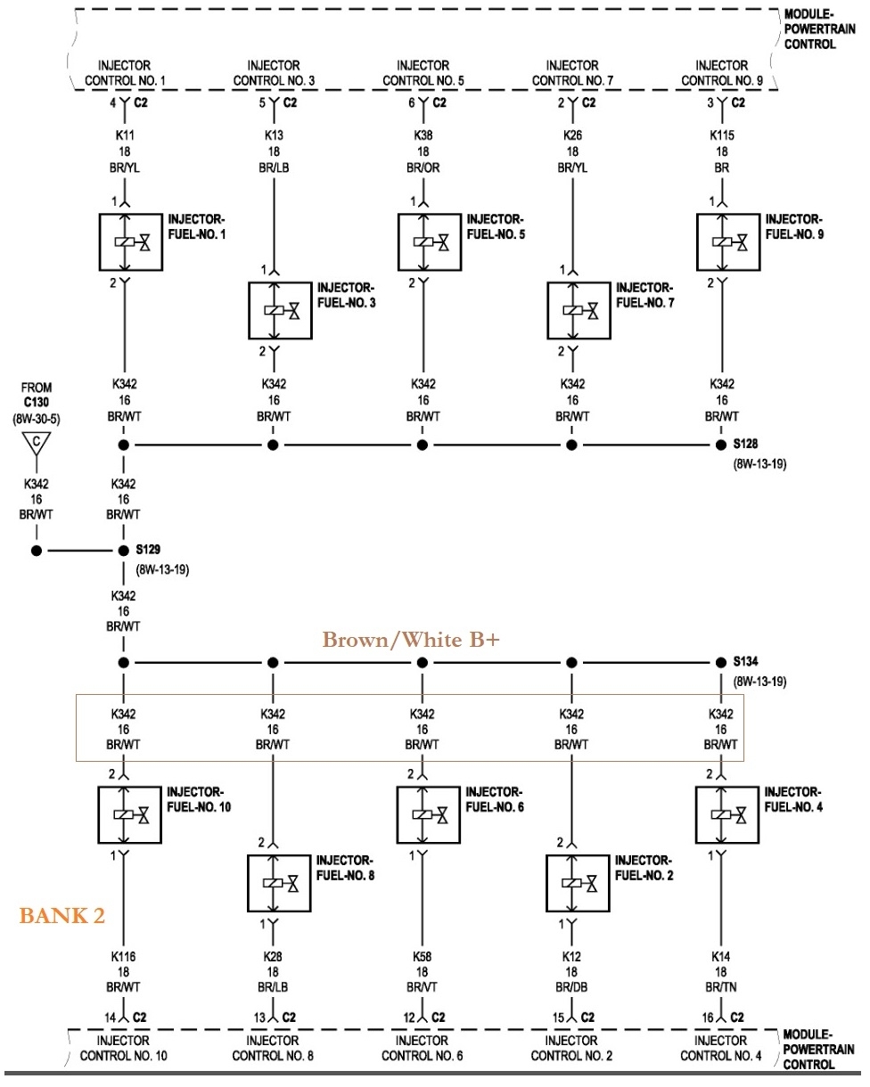 2nd diagram shows the fuel injector power wires the others are the ground side control wires, super easy to check for an injector pulse from the PCM.