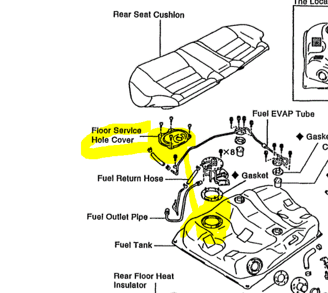 Next, you can not see the pump mount from under the vehicle, so we need to check it a different way. If you remove the rear seat, there is a service port that can be removed to replace the pump. Remove it and inspect around where the pump mounts for evidence of leaks. (See Pic 2)