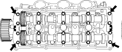 Apply sealant (TB-1 207B or equivalent) of bead diameter 2-3 mm at eight place of arched area of camshaft bracket on front and rear sides.