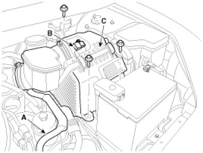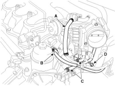 8. Disconnect the PCSV hose (A), fuel hose (B) and throttle body coolant hoses (C).