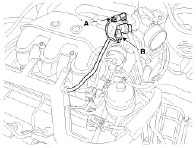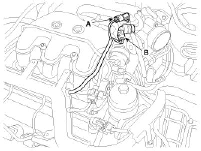 (1)Disconnect the breather hose (A) and the BARO sensor connector (B).