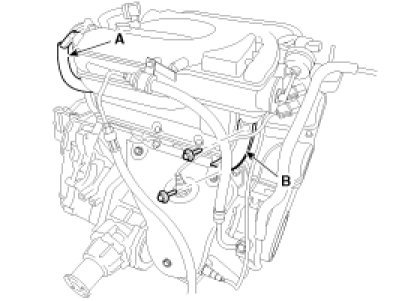 10. Disconnect the PCV hose (A) and remove the surge tank stay (B).