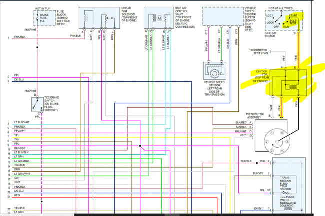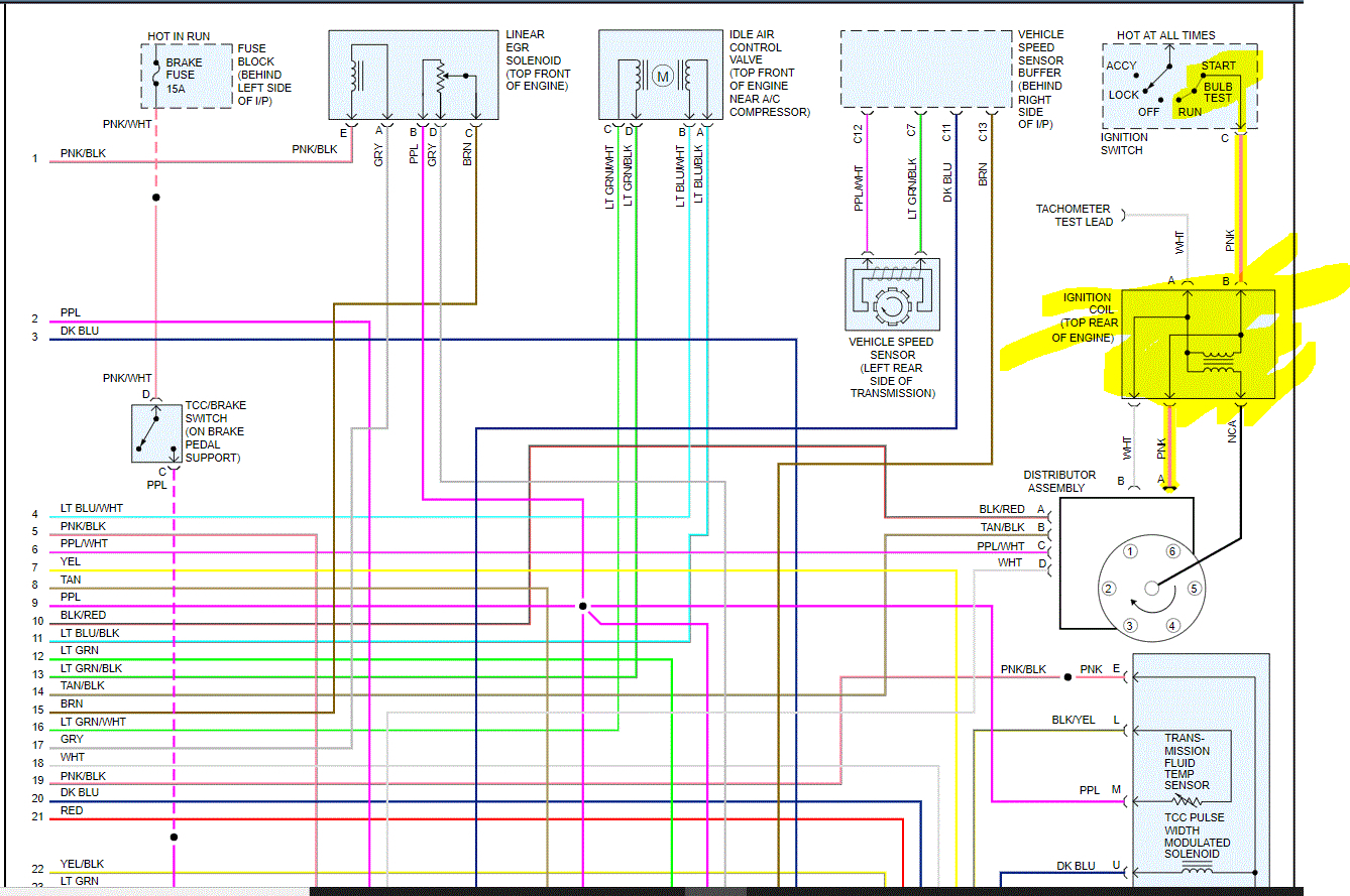 Additionally, I included the wiring schematics for the engine control circuits. I highlighted the coil primary circuit wire. Note that power comes from the ignition switch. Confirm it has power.