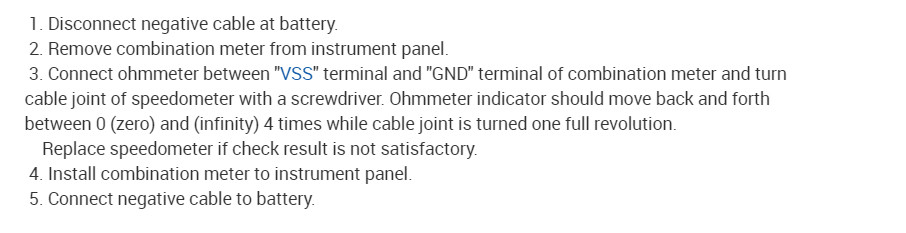 It looks like the Vehicle Speed Sensor [VSS] is located in the combination meter of your vehicle's instrument panel. In the diagrams down below I have included the diagnostic troubleshooting guide from the vehicle manufacturer for the VSS, which includes a diagram of it's location. To run the test, you will need a Digital Multi-meter [DMM], and here is a link below if you are unfamiliar with how to use one: