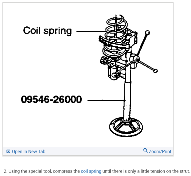 Now, the most dangerous part of replacing struts, if you aren't getting quick struts that come ready to be installed in your vehicle, is compressing the spring. Please take this part very seriously! I have included a picture of a strut spring compressor that Hyundai recommends using. Some people choose to use a spring compression tool that consists of two independent bolts and you tighten down to compress each side a little at a time to get even compression. You must watch for the rods slipping around the spring as it will cause uneven compression and likely injury. These are very dangerous and are commonly referred to as widow makers, so please use the utmost caution if you choose to use them.
