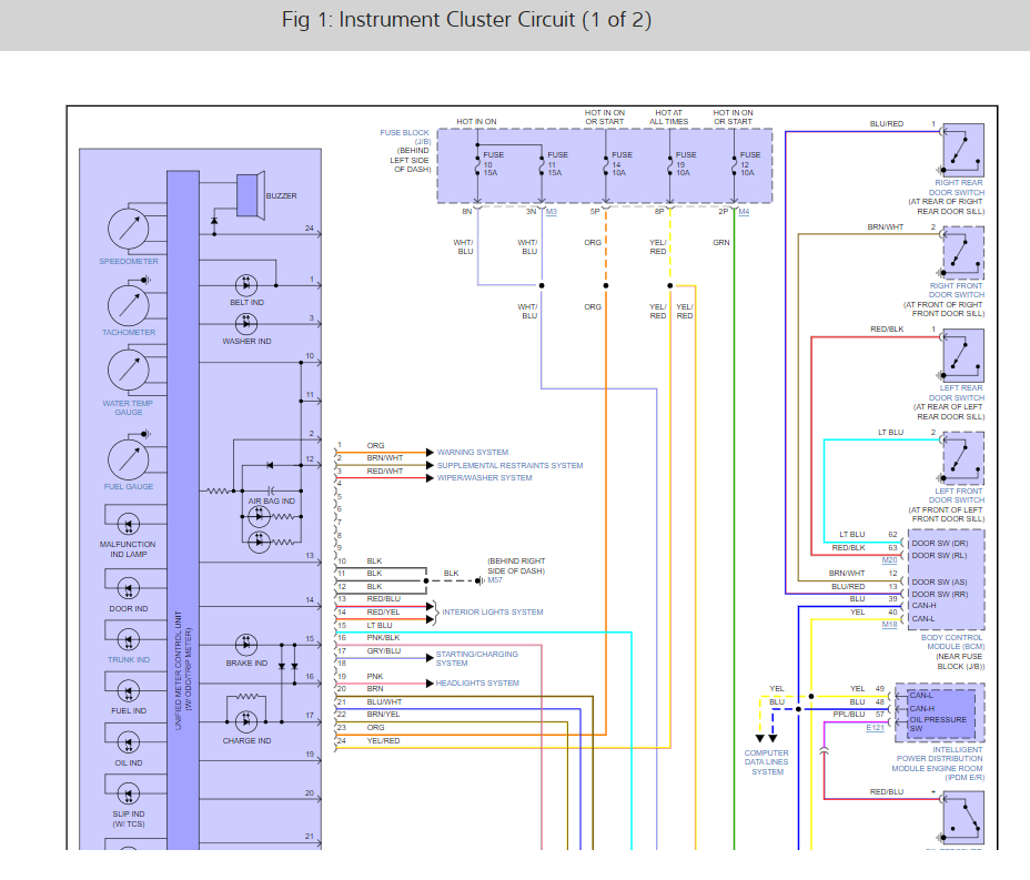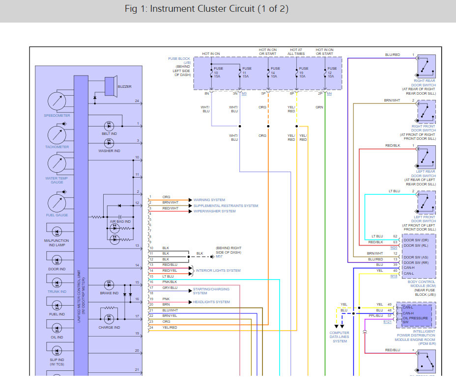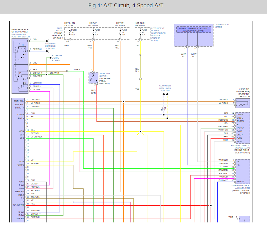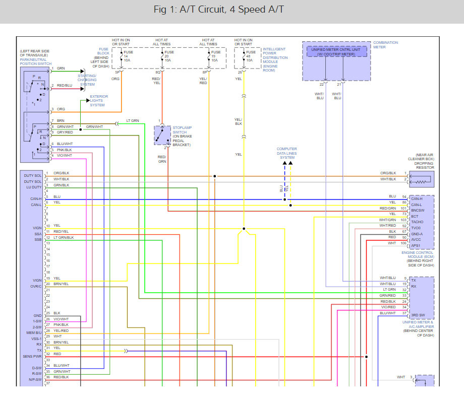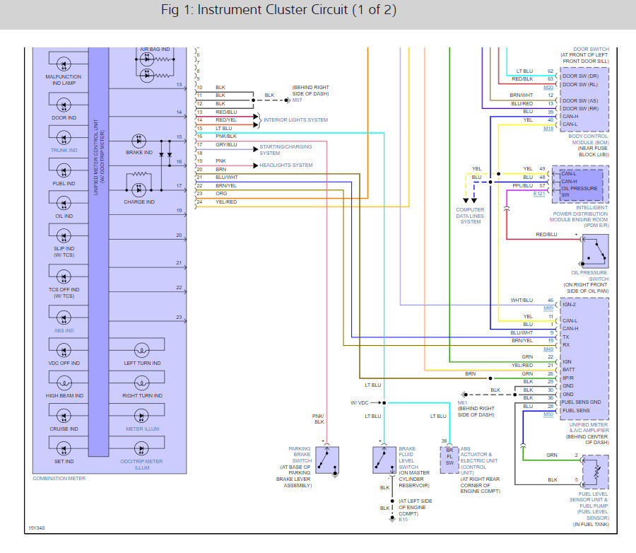 The vehicle speedometer is not functioning, but the transmission is working perfectly (shifting into gears). I thought the transmission should not upshift since the speedometer is not functioning. How can the combination meter be tested to know if the problem is not from the combination meter? Could I get a circuit diagram showing the relationship between transmission, combination meter and ECU?