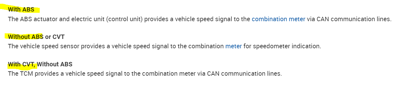 The speedometer function is based on different options on the vehicle. For example, if your vehicle has anti-lock brakes, the signal comes from the ABS module. If it has a CVT transmission, it comes from the transmission control module (TCM). If it doesn't have a CVT transmission or ABS, then it comes from the output speed sensor on the transmission. (see pic below)