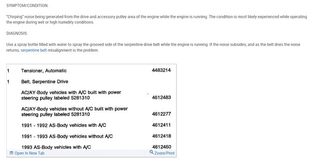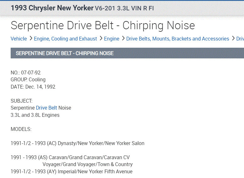 I'm driving a 1993 Newyorker. There's been a squeak from the belt area that almost sounds like a chirp. I've replaced the alternator. The belts been replaced (although maybe could have received damage since because of a missing mud guard during winter and also a hole in my radiator from hitting a deer) I've replaced the water pump and tensioner Pully (not the housing) and have cleaned all pulleys. I suspect that maybe it could be the tensioner pulley housing that's losing tension as the motors running causing it to intermittently chirp but I have had other ideas that weren't, and I don't want to move forward I thought I'd ask first what the best way to diagnose it from here is. Thanks, John