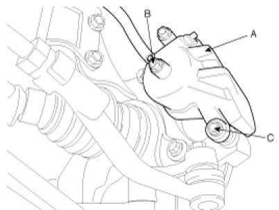 1. Remove the brake hose bolt (B) and the guide rod bolts (C) from the caliper assembly (A).