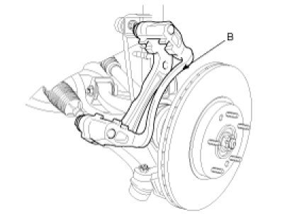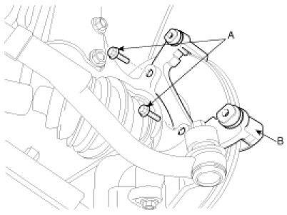 2. Install the caliper bracket (B) and tighten the caliper mounting bolts (A).