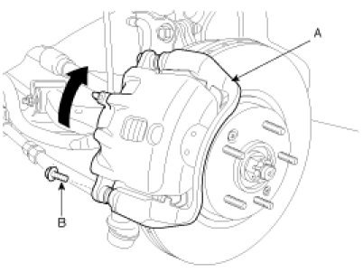 1. Remove guide rod bolt (B) and raise the caliper assembly (A).