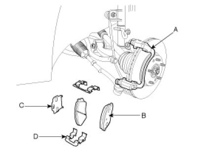 3. Remove the pads (B), the pad shims (C) and the pad retainers (D) from the caliper bracket (A).