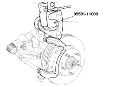 5. Push in the piston using the SST(09581-11000) so that the caliper will fit over the pads. Make sure that the piston boot is in position to prevent damaging it when installing the caliper.