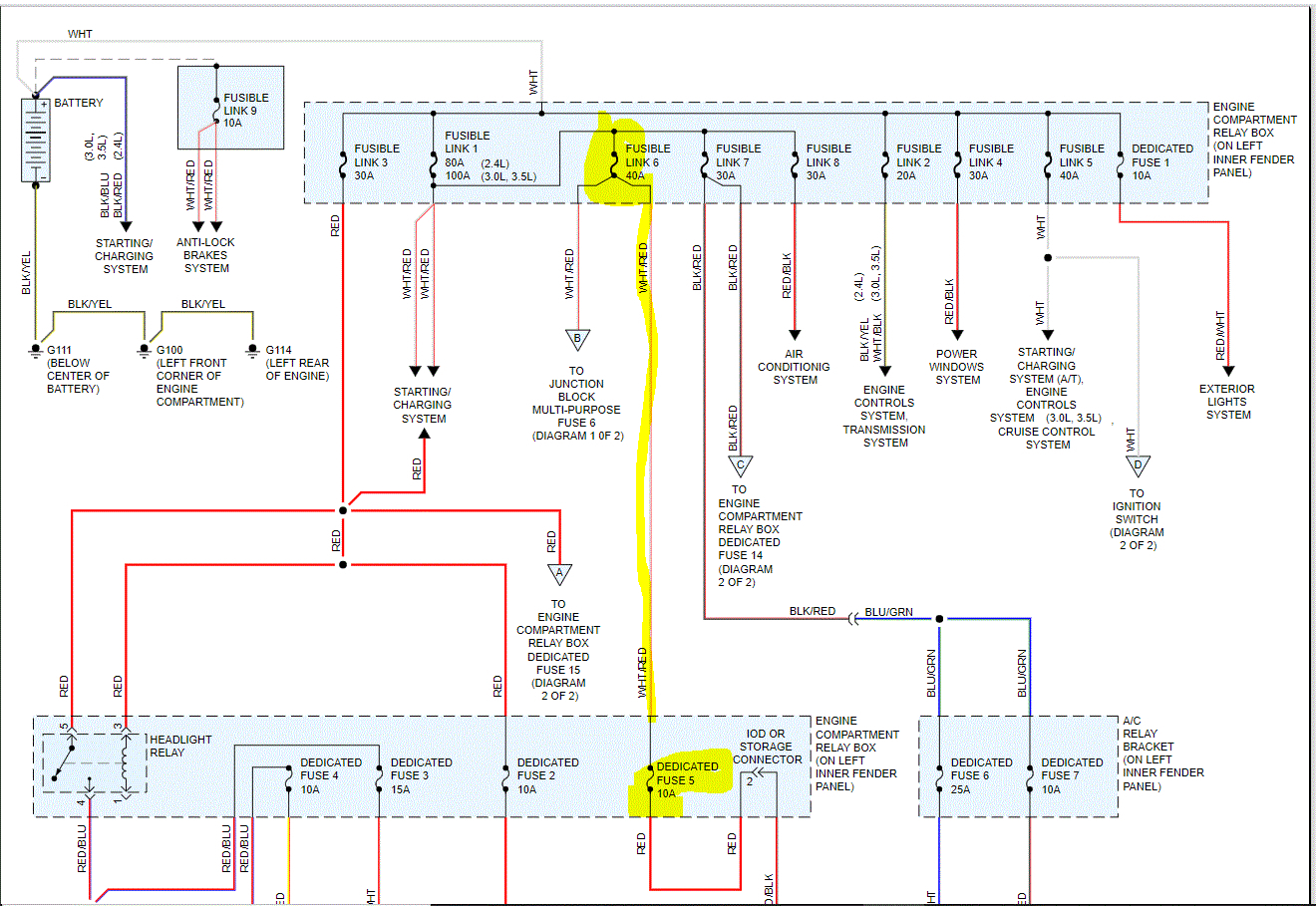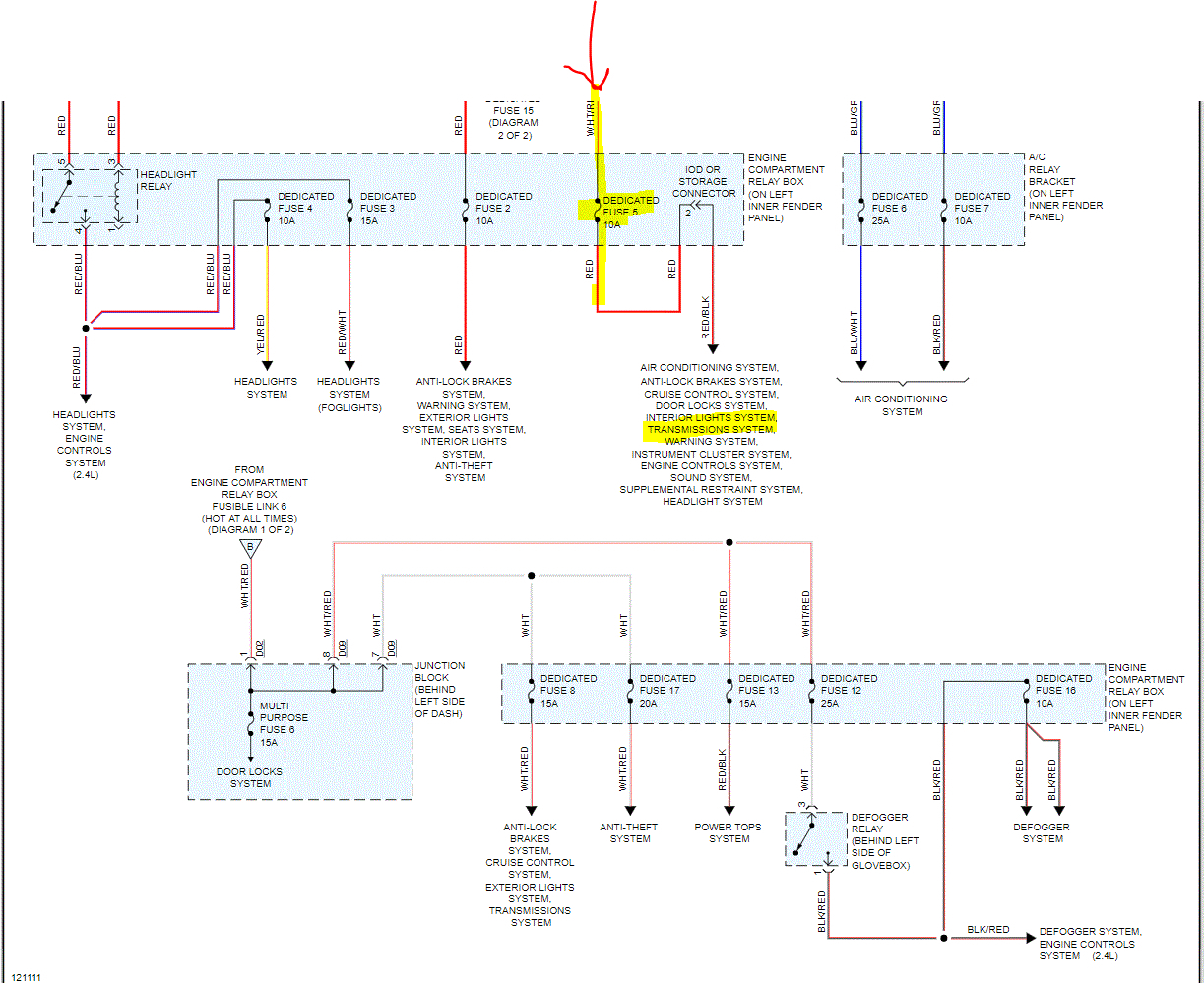 At highway speed, vehicle stalled with hard stop of drice tires. Continued on to get off road, engine runs fine but it won't shift out of second gear. Also, no power to test port or power locks. Door chime is not working either. Scrap yard transmission with less than 10,000 miles on it. Test port will not power on the scan tool, so no codes.
