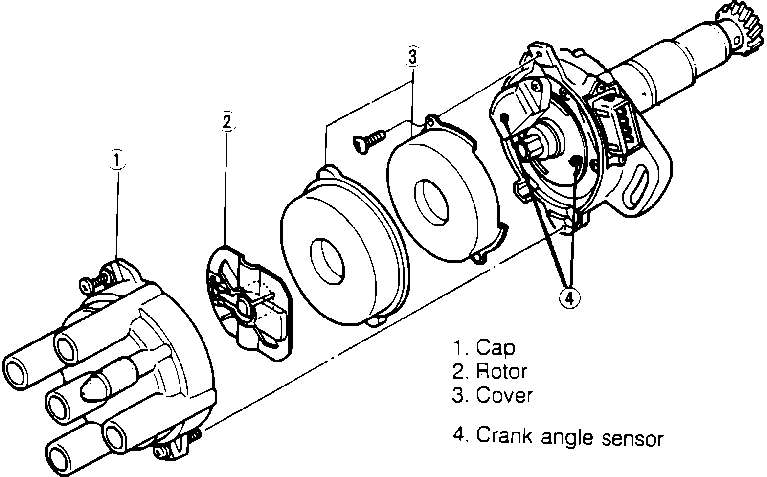 The distributor utilizes a photo-diode type crank angle sensor consisting of a slotted disc that turns with the distributor shaft and a stationary pick-up assembly. As the disc rotates past the pick-up, the slots (one for each cylinder) alternately pass and block photo-diode light transmission. Signals generated are interpreted by the ECU to determine crank angle (#1 cylinder TDC) and engine rpm. To calculate ignition timing, the ECU uses this input together with several others related to vehicle operating conditions. Except for the initial setting, ignition timing is under ECU control.