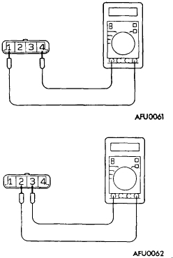 Measure the resistance between terminal 1 and terminal 4 of the connector at the idle air control motor side. Standard value: 38-52 ohms [at 2O°C (68°F)]
