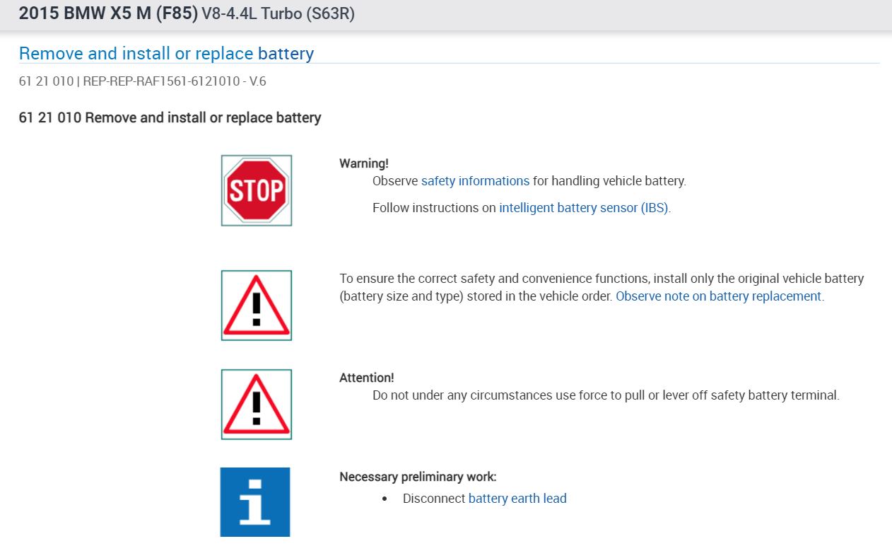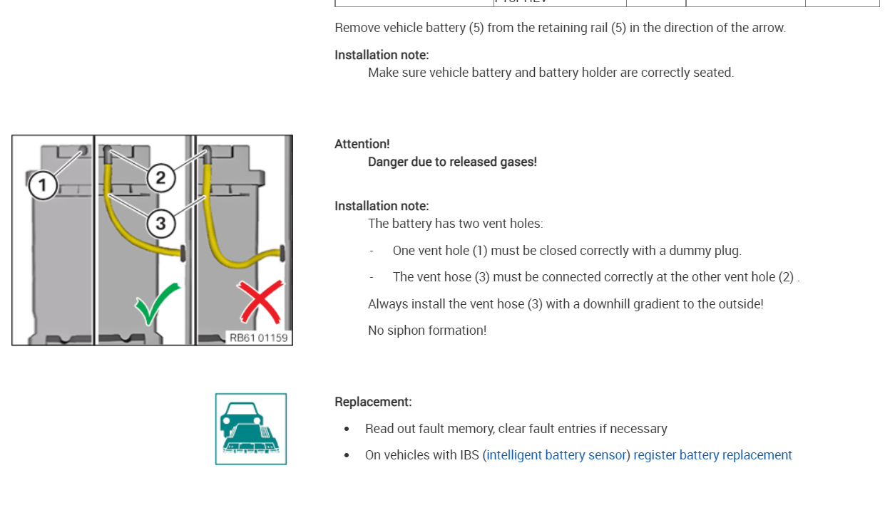 Vehicles with the automatic engine start-stop function or particular engine types and optional equipment are equipped with a special vehicle battery (AGM battery), since only this battery type can provide elevated power requirements over the extended service life. Installing a different vehicle battery can cause problems with vehicle electronics, can reduce functions or can cause leakage of battery acid.