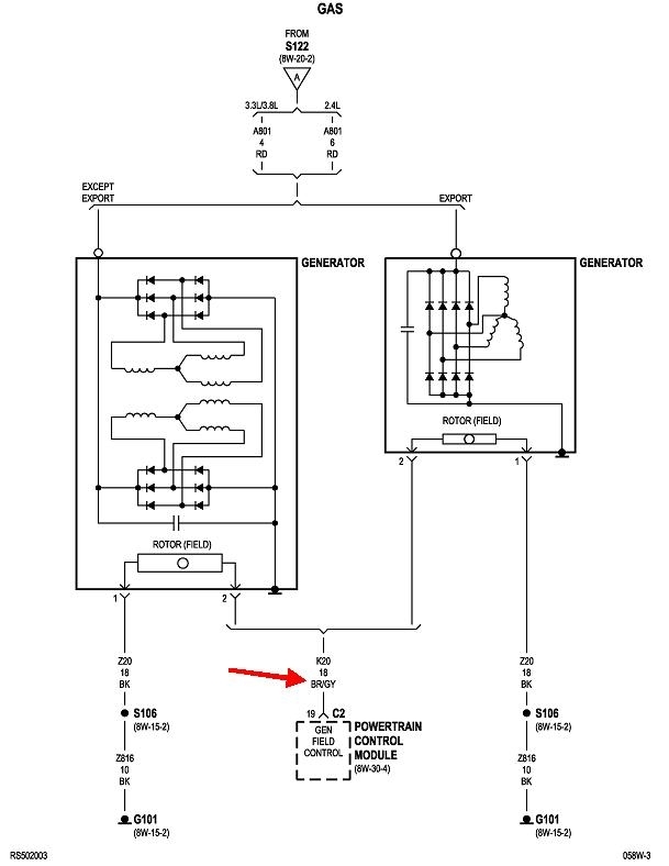You can also try measuring the continuity between these two terminals. That must be done with the engine off. It is not uncommon to find an open circuit due to little chunks of dirt sticking under the brushes when the rotor isn't spinning. In that case, irritate it a little by tugging on the belt. If you still get an open circuit reading, the brushes are worn. This always starts out as an intermittent problem. The brush assembly can be replaced separately, but it is more common to just replace the entire alternator.