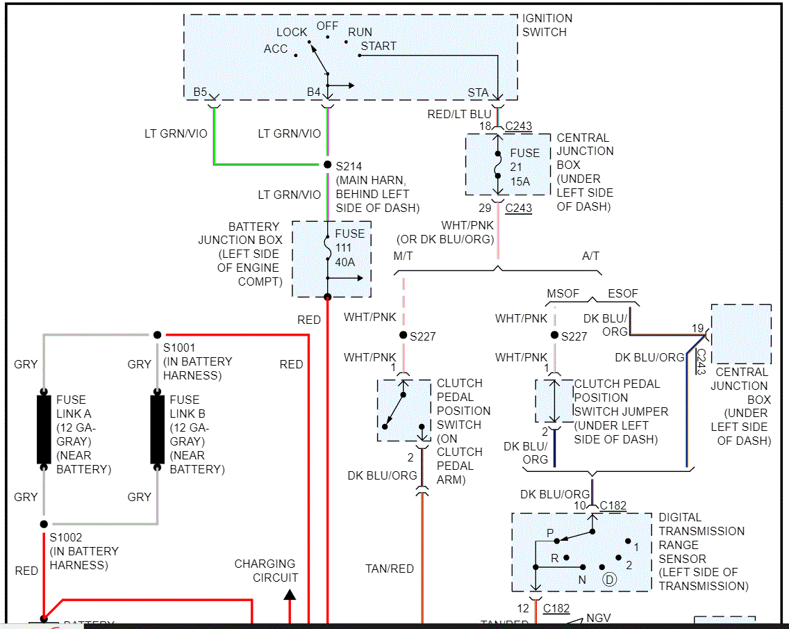 I attached the wiring schematic below for the starter circuit. At the starter, there will be a heavy gauge wire and one that is smaller. The smaller one should only have power when the key is in the start position. The larger wire has B+ at all times.