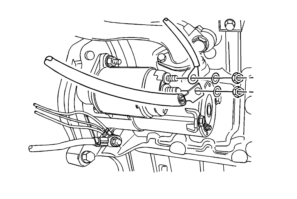 Remove the nut which secures the starter ground wire to the lower mounting stud and remove the ground wire.