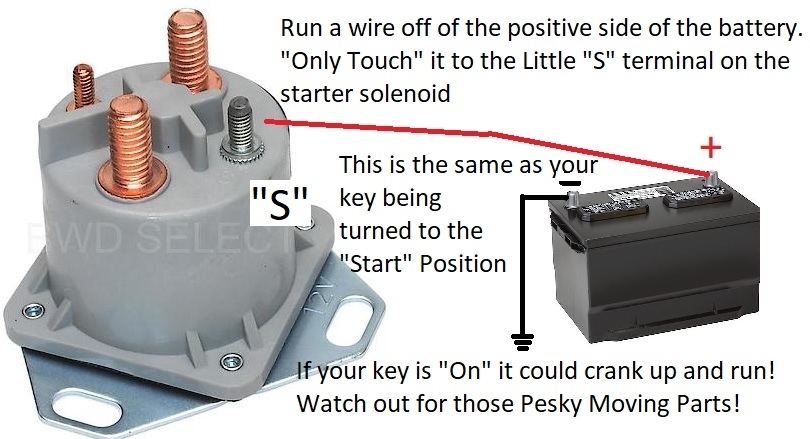 Insure you are in "Park" take "S" wire off of the solenoid touch a jumper from the battery to "S" terminal-only tough it, if you leave it on there and it cranks, it will not stop until you get it loose.