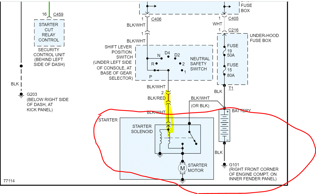 Now, if the smaller wire does get power when the key is in the start position, the starter is bad. If you look at the attached picture, I circled the starter and highlighted the smaller wire I am referring to. Have a helper turn the key to the start position while you check if there is power to that wire. Note the other wire (the larger one) goes direct to the battery and should have 12v all the time.