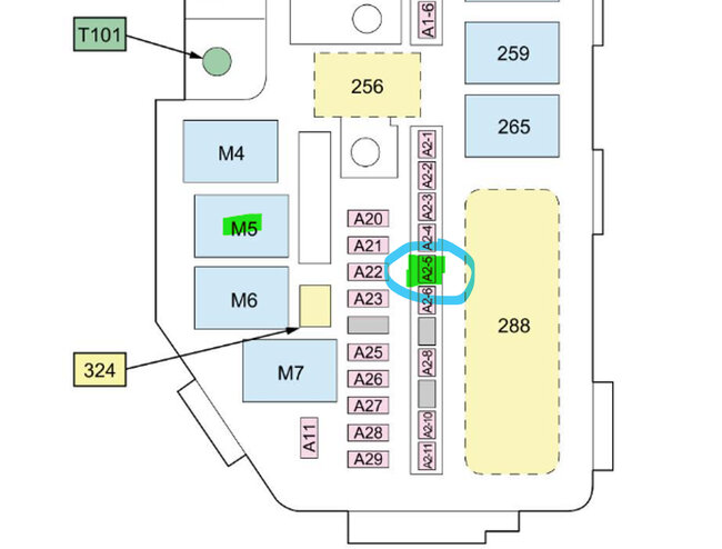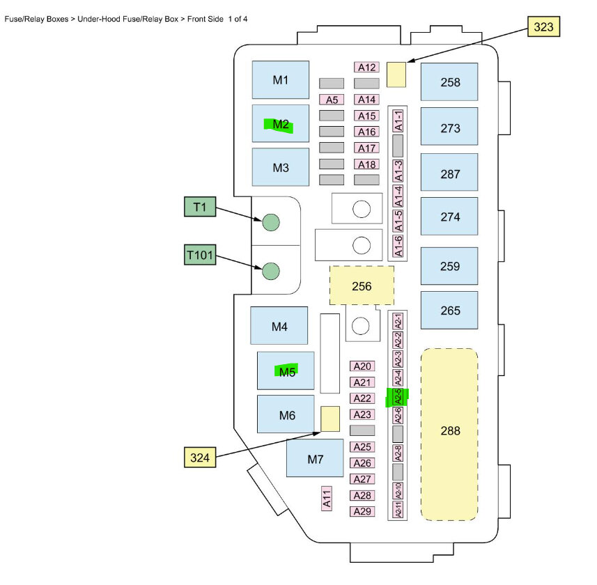 The 1st diagram is the under-hood fuse panel, M2 and M5 are the Starter Cut Relays marked in green, Fuse 2-5 is also marked in green.