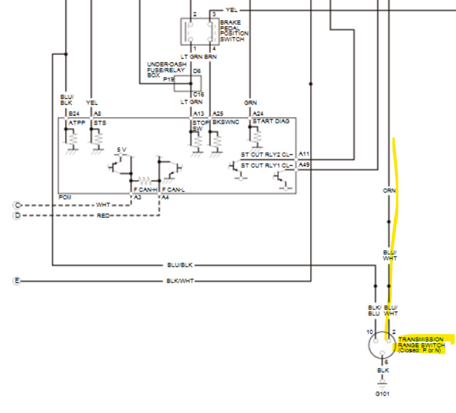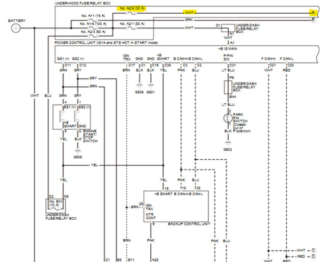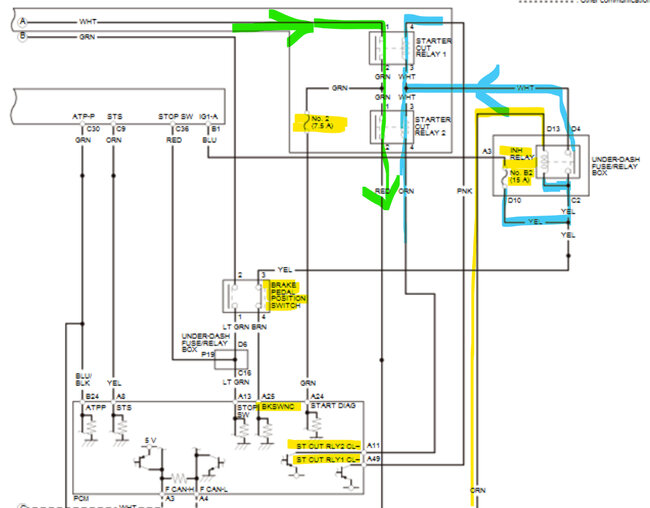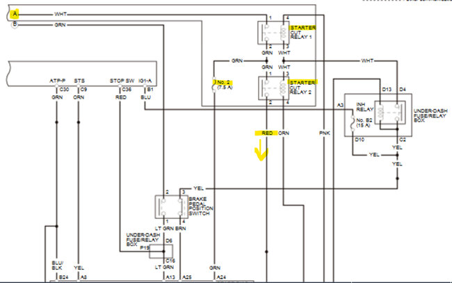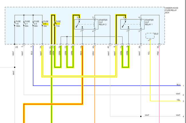 In the 4th diagram, which is an aftermarket diagram, fuse 2-5(30amp) feeds power to Starter Cut Relay number1, then to Starter Relay Cut number 2, which in turn feeds power to the Starter via the Red wire. But both relays need to be energized for this to happen. The fuse labelled 5(7.5amp) goes to the PCM on a green wire as a signal that Relay 1 has energized.
