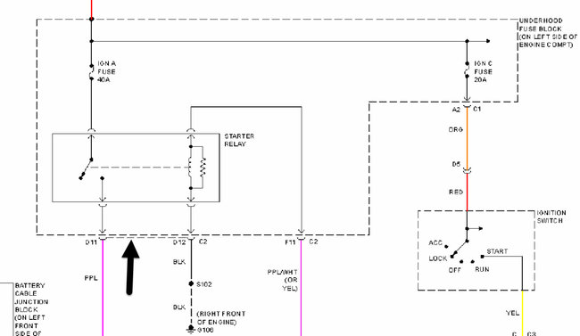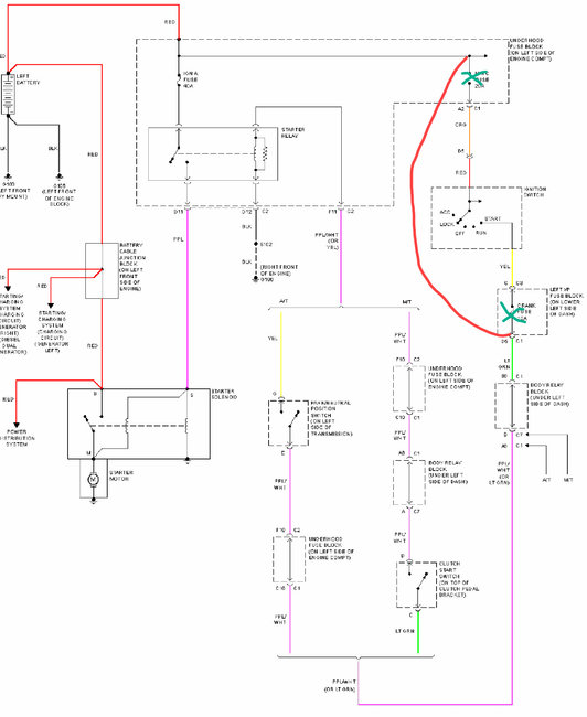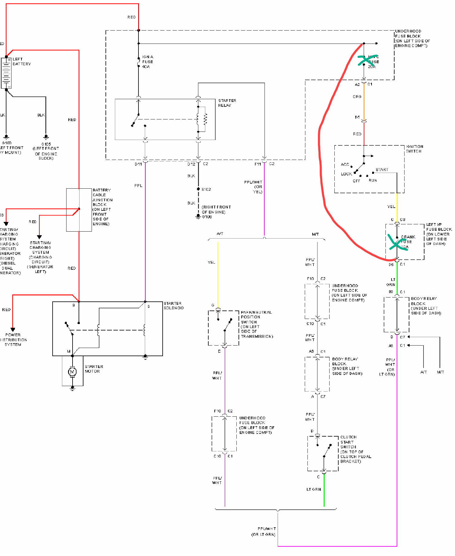 Your neutral safety switch and its circuit have to be okay. If we start at the beginning, everything between the two red arrows has to be okay, otherwise the 40-amp fuse would blow as soon as you installed a new one. In fact, it doesn't blow until the relay switches on.